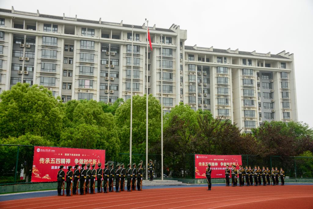 迎著清晨的微風,國旗護衛隊踏著整齊有力的步伐護衛國旗入場,伴著激昂雄壯的《義勇軍進行曲》,國旗冉冉升起,在空中迎風飄揚,全體師生行注目禮,齊唱國歌。國旗護衛隊黨支部黨員代表丁歡歡、吳昱景講述微黨課《五四精神與新時代青年的使命》,黨員代表張晉搏帶領全體同學進行《以青春的名義宣誓》。“點亮青春理想,激昂奮斗旋律,澎湃創新動力,淬煉斗爭精神”的錚錚誓言在體育場回響。與會師生簽名,許下對青春,對未來的莊嚴承諾。