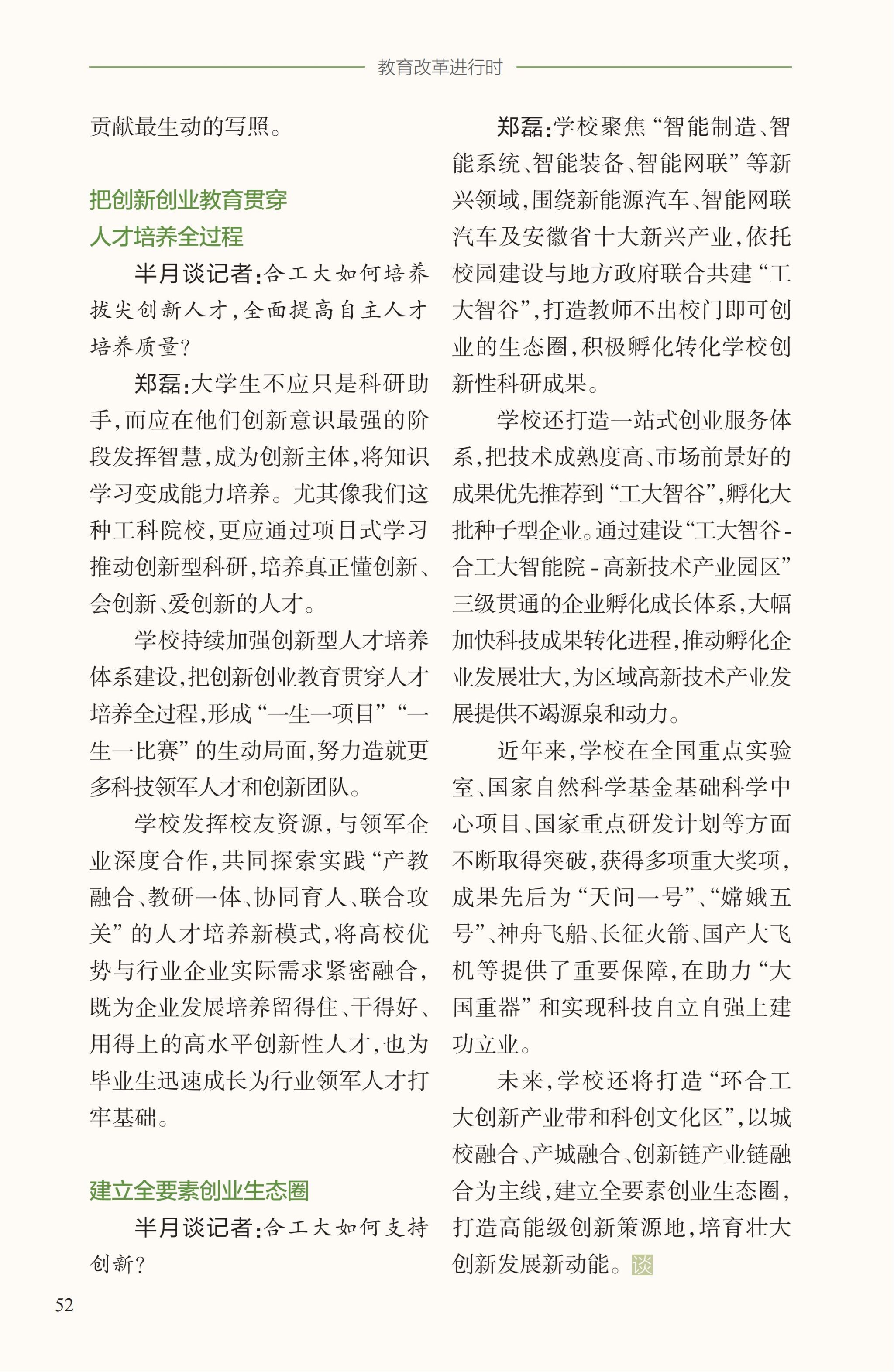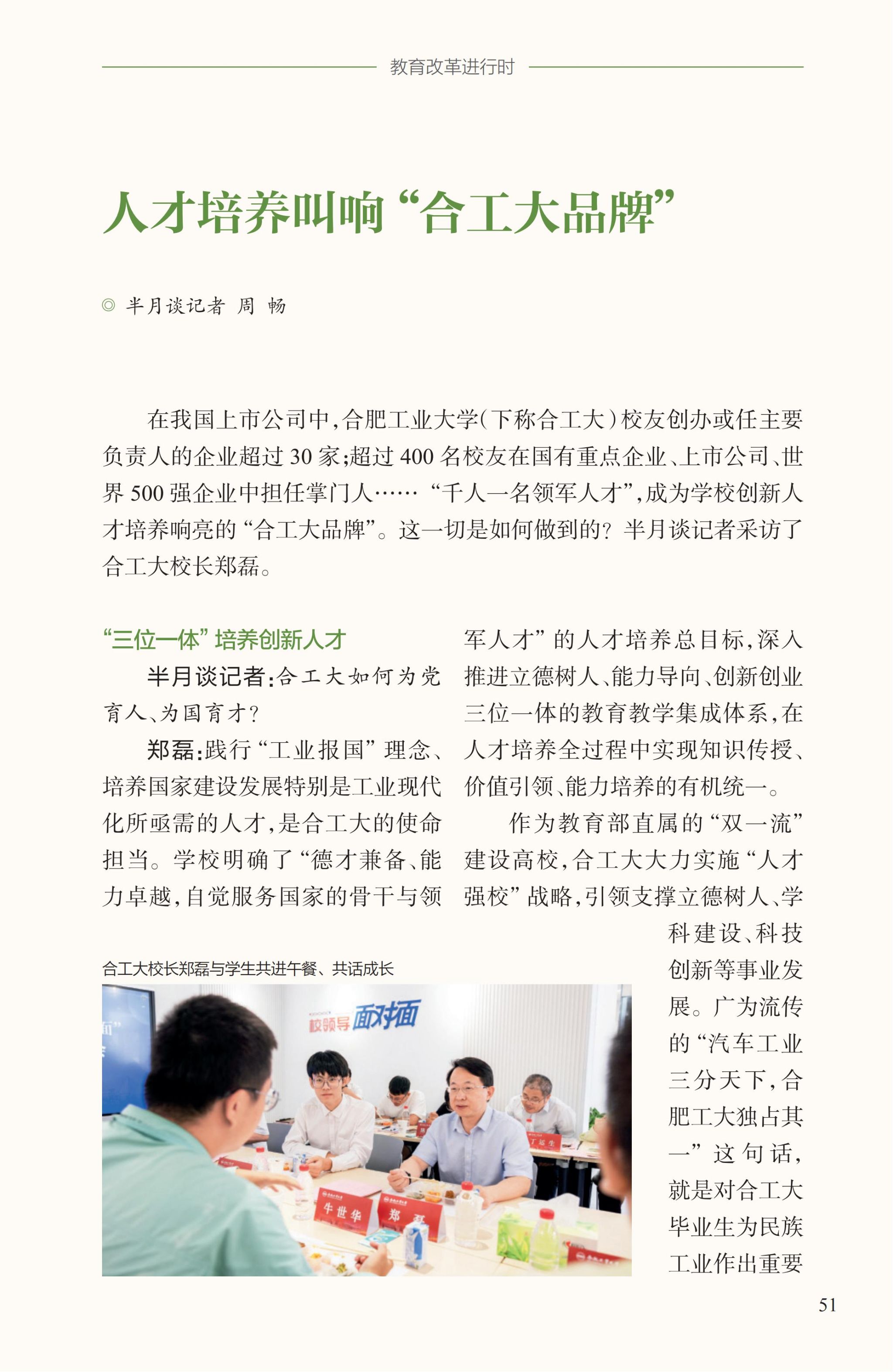 在我國上市公司中,合肥工業大學(下稱合工大)校友創辦或任主要負責人的企業超過30家;超過400名校友在國有重點企業、上市公司、世界500強企業中擔任掌門人……“千人一名領軍人才”,成為學校創新人才培養響亮的“合工大品牌”。這一切是如何做到的?半月談記者采訪了合工大校長鄭磊。