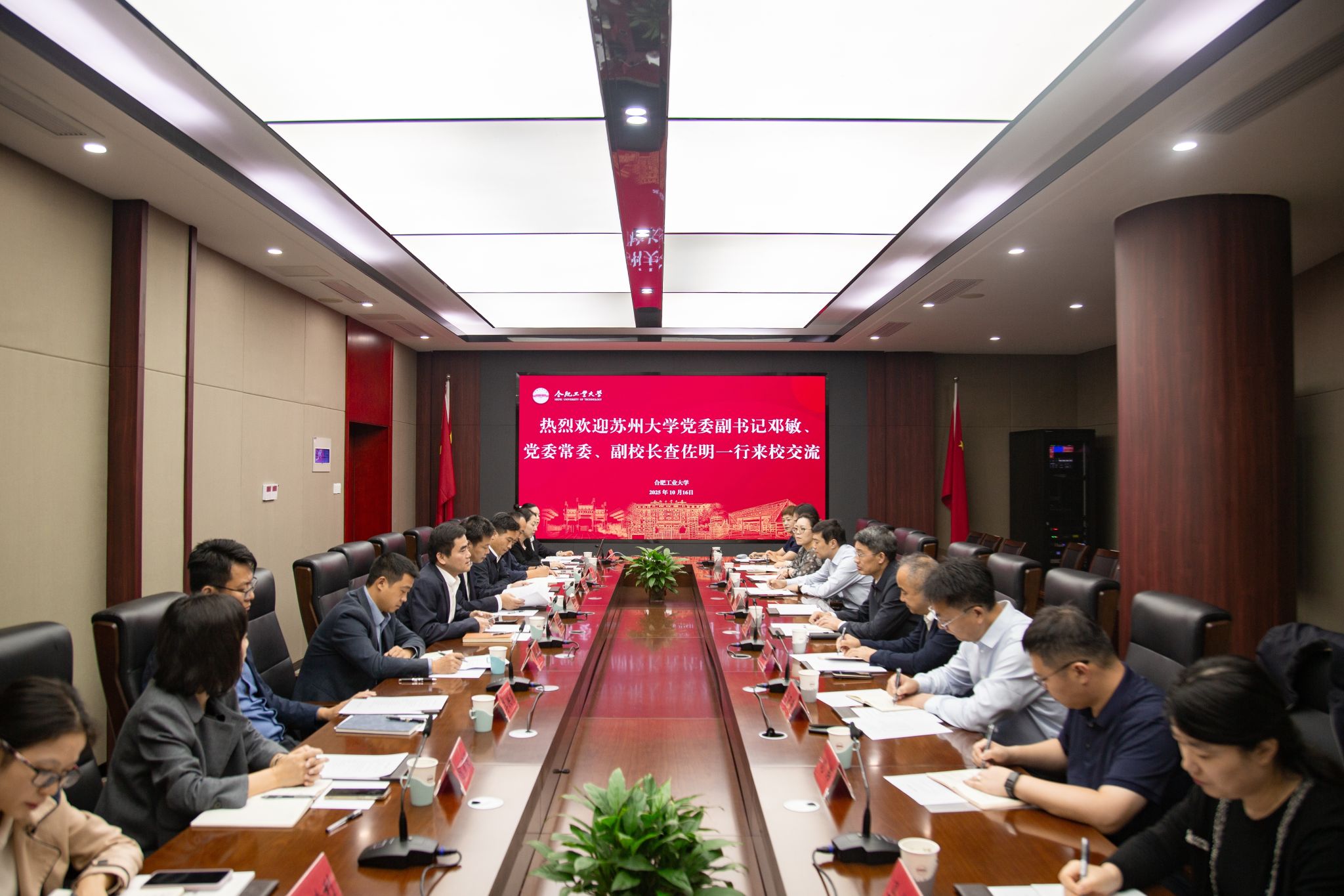 會上,嚴福平對鄧敏、查佐明一行的來訪表示歡迎,并介紹了學校歷史沿革、人才培養以及社會服務等方面的創新舉措與成效。嚴福平指出,建校80年來,學校始終深懷“工業報國”之志,主動對接國家重大戰略需求和地方經濟發展實際需要,培養了50余萬名畢業生,為國家工業體系建設作出了重要貢獻,形成了“千人一領軍”的創新人才培養品牌。蘇州大學作為國家“雙一流”建設高校,與合肥工業大學的交流源遠流長,兩校情誼深厚、合作前景廣闊,希望雙方進一步加強優勢互補,提升辦學水平,攜手為服務長三角建設做出更大的貢獻。