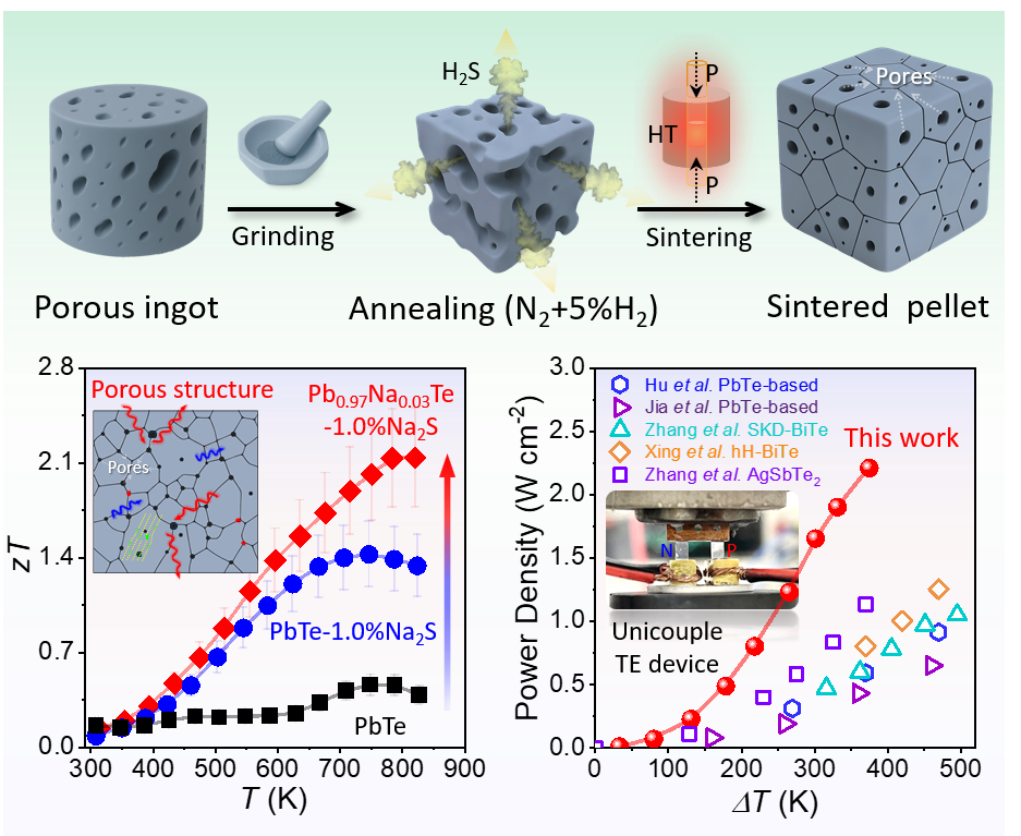 圖1.Na2S協(xié)同設(shè)計(jì)多孔PbTe熱電材料:工藝與機(jī)理示意、材料的熱電性能,以及單對(duì)偶器件的功率密度及其與文獻(xiàn)的對(duì)比。