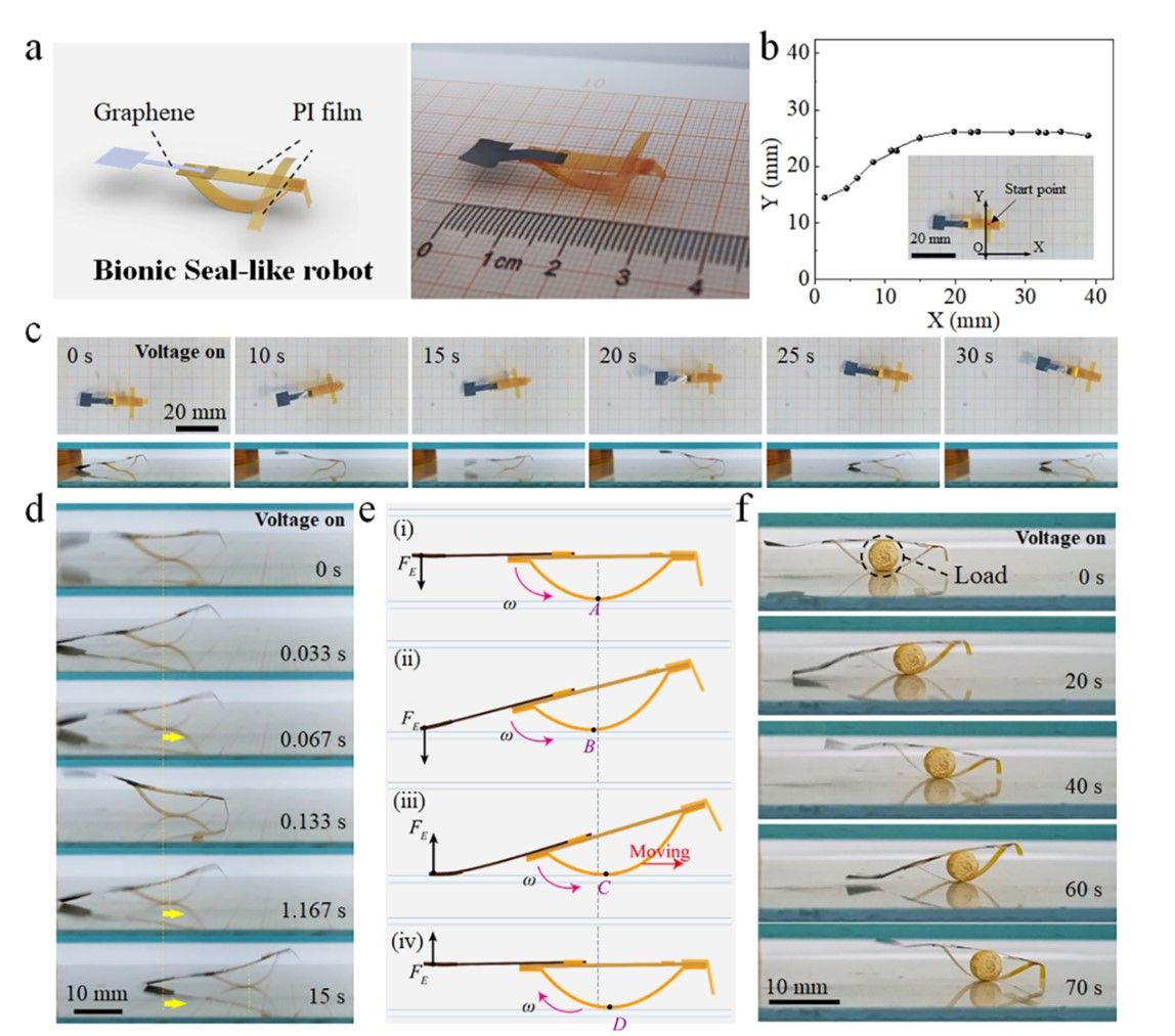 圖3 以石墨烯振蕩器為馬達的仿海豹機器人在電場驅動下自主爬行運動,及攜帶物體運動