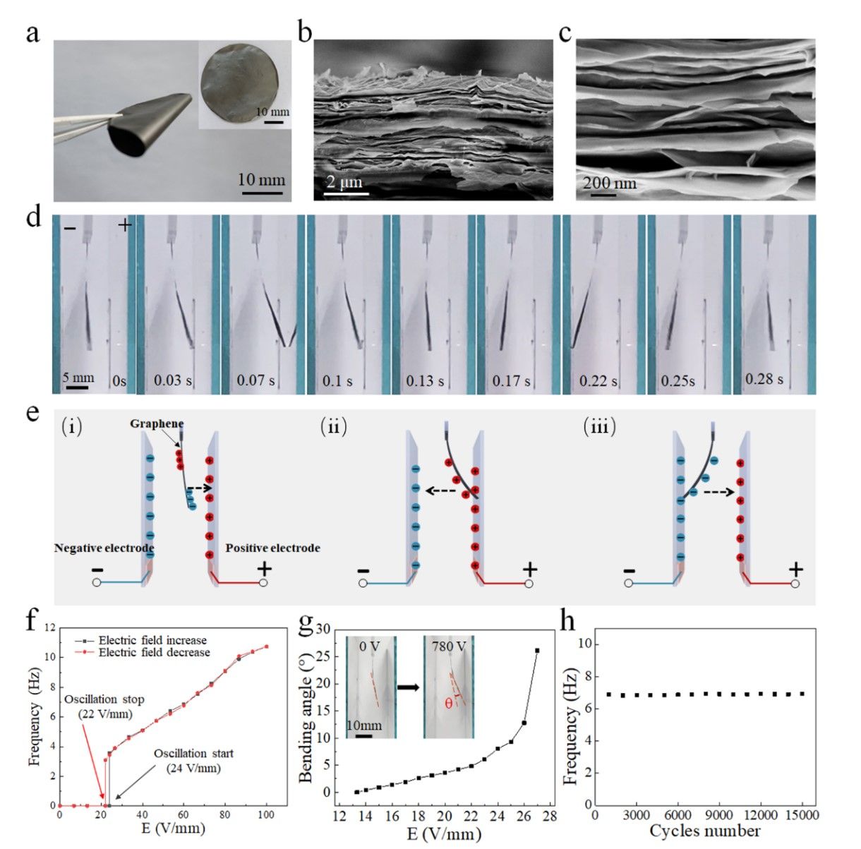 該石墨烯振蕩器為懸臂梁結構,放置在兩平行板電極之間,一端固定,另一端自由懸掛。在電極之間施加360V的直流電壓(電場強度為24 V mm?1),石墨烯薄膜在兩電極之間產生了持續的彎曲振蕩。其振蕩運動的驅動機制歸因于靜電感應效應,以及荷電極性變化引起的靜電力方向變化。振蕩運動的頻率可通過施加的電壓來控制,在100Vmm?1的電場強度下,振蕩頻率可達10.8 Hz。