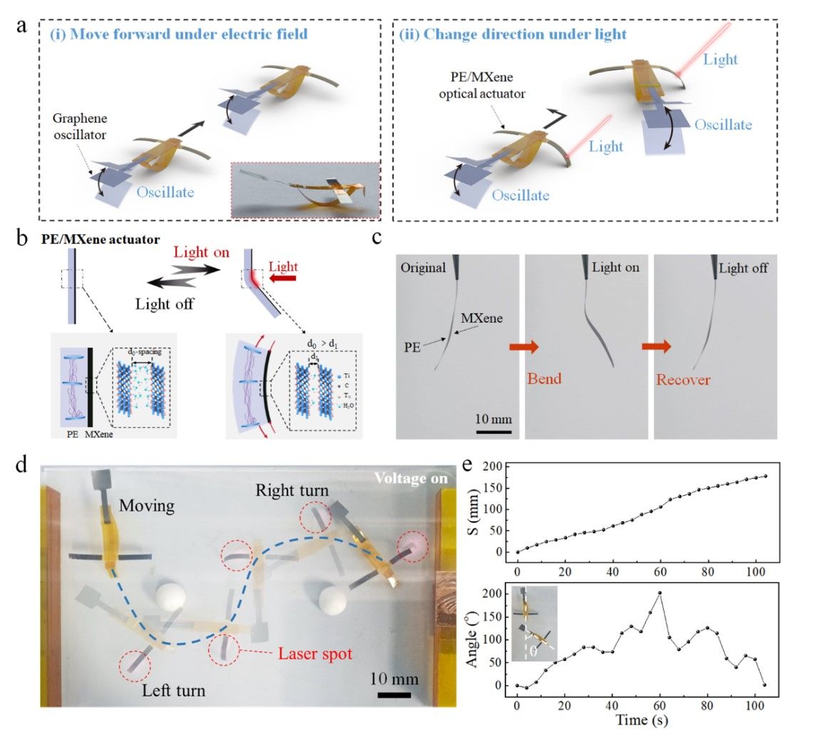 近日,我校胡穎研究員、常龍飛副研究員團隊與趙玉順教授合作,發展了一種靜電驅動的石墨烯振蕩器,并受海豹運動啟發,進一步設計了一種電壓/光照協同驅動的仿海豹機器人,其中石墨烯振蕩器提供推進力,柔性光驅動器控制運動方向。該機器人能夠在電/光刺激下實現攜帶物體移動、繞開障礙物等可控運動。相關成果以“Seal-Bioinspired Electrostatic Oscillation-Based Soft Robot with Light Tunable Locomotion”為題發表在《Advanced Functional Materials》上。