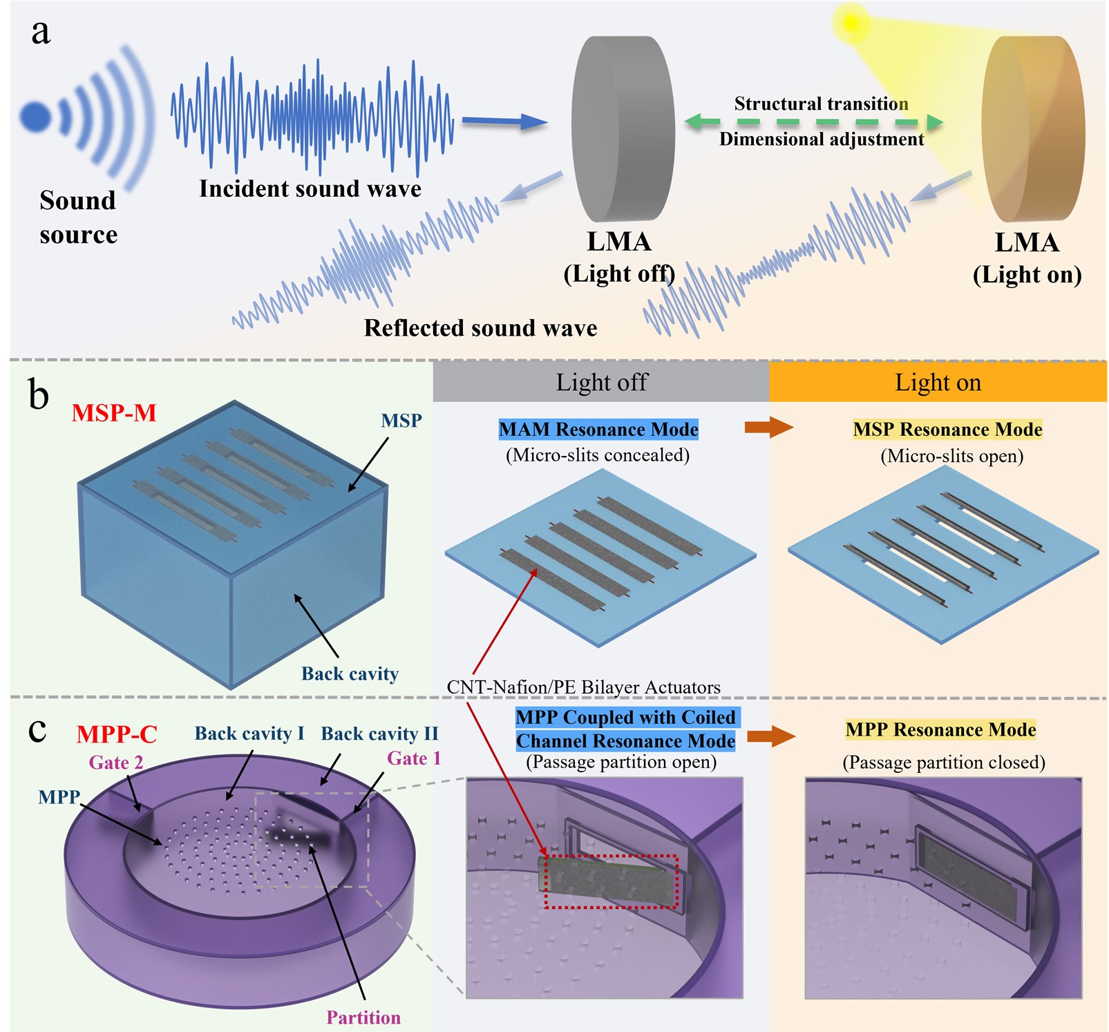 在柔性智能光驅動器的應用方面,該團隊針對低頻噪聲污染的高效聲衰減需求,與愛沙尼亞塔爾圖大學等多單位合作,首次將光活性聚合物智能材料與聲學超材料結合,提出了一種新型可編程光調制吸聲體(LMA)的概念,其通過光響應柔性智能驅動材料實現了無束縛、超寬帶聲學調制。與幾何結構固定、可調性有限的傳統超材料不同,LMA可在緊湊構型中實現超材料結構轉變與尺寸參數調節,從而在低強度光刺激下,實現對吸聲特性的可編程控制。相關成果以“A programmable acoustic metamaterial: achieving untethered ultra-broadband modulation with photoactive structural transition”為題發表在《Materials Horizons》上。