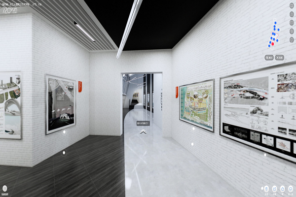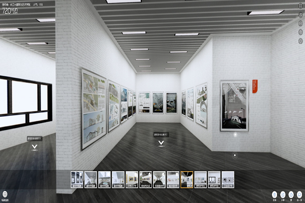展廳基于設計類專業教學成果的圖紙化、可視性,建立“虛擬漫游云展廳”,即在三維實景漫游系統基礎上,原創自建模生成線上情境展廳。教學成果圖紙、創作與設計方案貼圖置于展廳內部,采用720微全景方式,可根據作品性質、效果、大小選擇合適的展覽位置,并可模擬參觀者行走路線進行實景觀看,點擊感興趣的作品還可以進行放大觀賞。